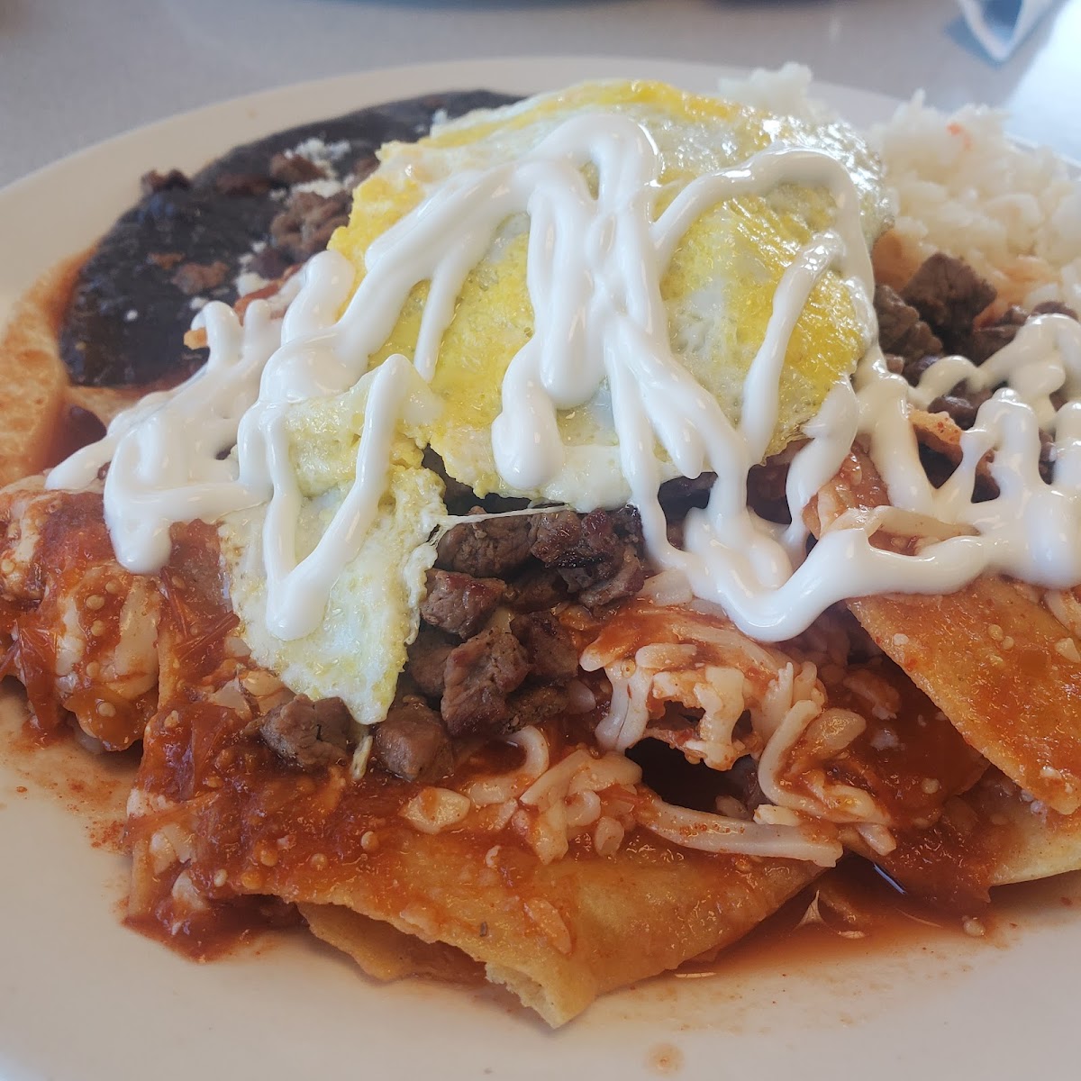 Wonderful food, reasonable price. We also got the flan but it got demolished before we even got a photo! Will definitely be back for more. We got the steak and chimichurri and chilaquiles and they were delicious! The rice portions were a bit generous for me because my plate also came with potatoes. I gave the bread to the chilaquiles eater. We will definitely be back. Thank youuuu!